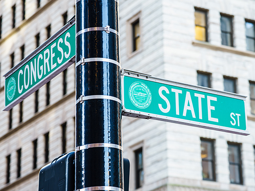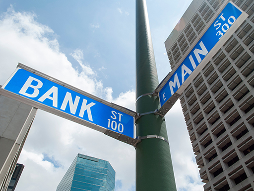 Cantilever arm bracket supporting street name sign, showing heavy-duty side-mounting solution with high traffic clearance