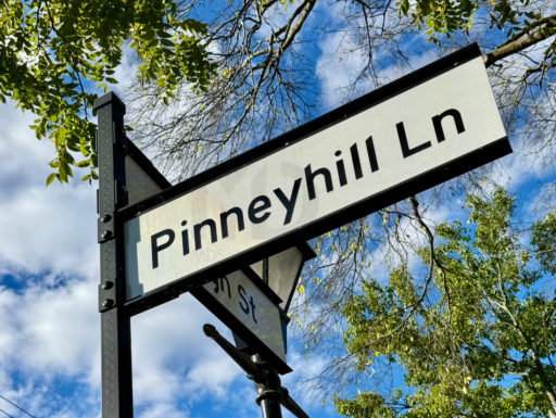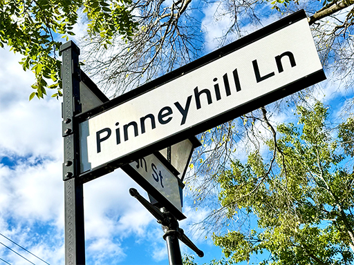 Cantilever saddle bracket (powder coated in black) secures street name sign in a suburban setting
