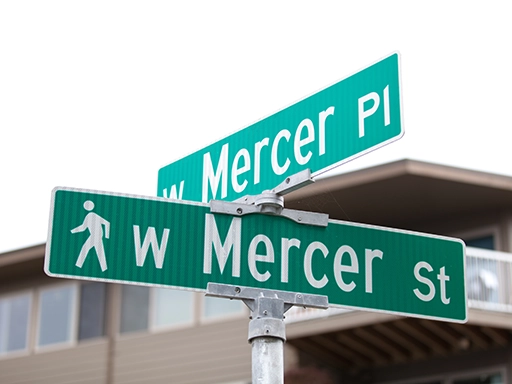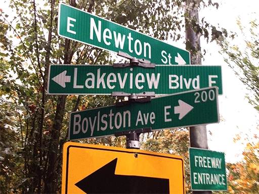 Post Cap and Cross Piece Application: Multiple Street name signs using adjustable angle cross piece mounting system at complex intersection